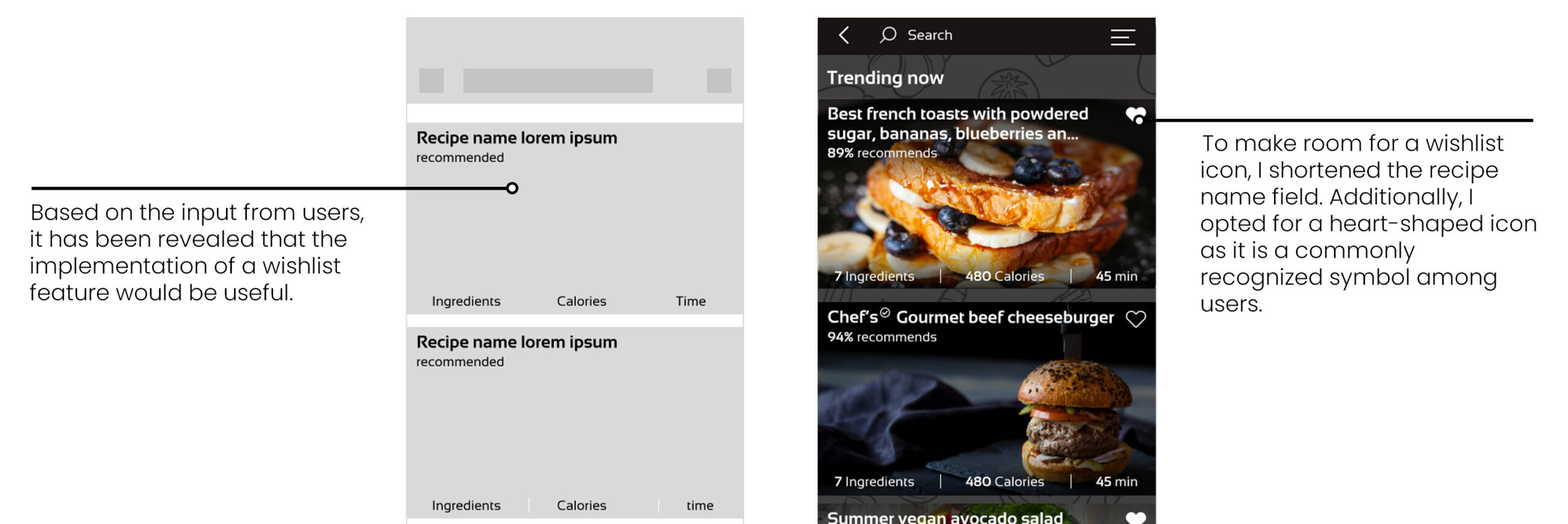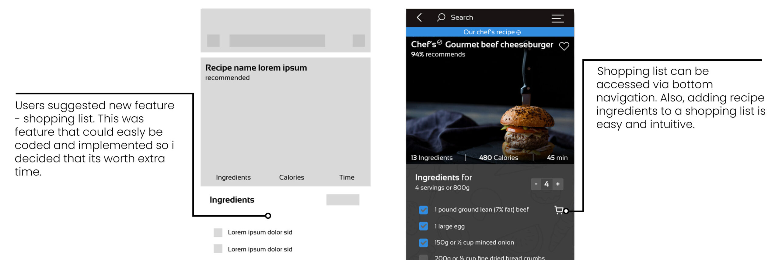 The solution was to implement a feature in filters that allowed users to enter the ingredients they have on hand and receive recipes that use said ingredients. The app would also suggest recipes based on users’ dietary preferences and food restrictions, which was also a pretty common requirement for users.